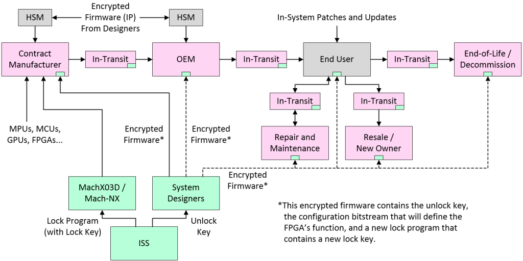 Now, take a deep breath and we’ll walk through this step-by-step. Let’s start with the folks at INTEGRITY Security Services (ISS), whose mission in life is to deliver end-to-end, layered, embedded security solutions to protect intelligent devices and their supply chains. In this case, ISS oversees the loading of the initial lock program and any associated cryptographic keys into the MachXO3D/NX FPGAs, which are then shipped to the contract manufacturer. Meanwhile, the corresponding unlock key is shipped to the company that designed and owns the system.