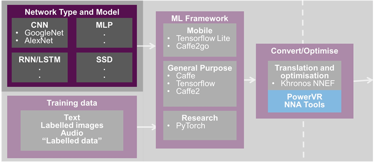 The image above shows not just the types of neural nets that can be built (highlighted), but also the offline flow for training them. This then feeds into the platform for execution, as shown below.