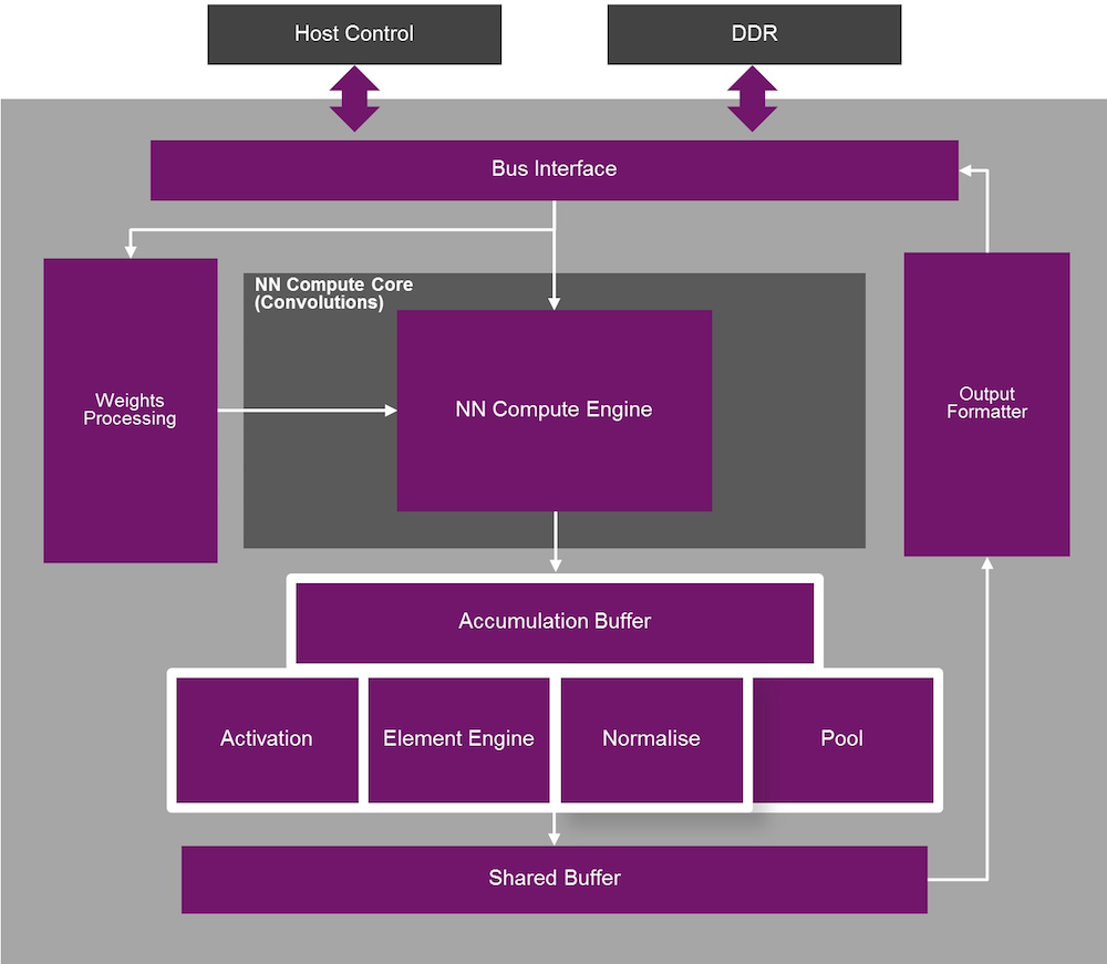 The main bit has a generic engine for those layers that are doing neural processing – that is, using a set of trained weights to generate one stage of the net. There are other built-in blocks for handling some of the other more administrative layers like pooling. Like Cadence, but unlike Synopsys, the block attaches to a separate host processor. We’ll talk more in a minute about who does and doesn’t think that’s a good idea. (Yeah, probably not hard to guess.)