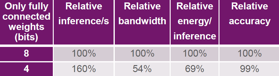 As to the training, it usually starts with floating point numbers. So you then have to discretize to a bit width, and if you use an irregular number, then you may have to go back and retrain to tweak the weights. There are a number of ways both to retrain and to reduce the overall size of the solution; it’s typically an iterative process. So it can be more work than simply using 8 or 16 bits, but they see the benefits as being worth it for applications that don’t have unlimited resources. (You can find out more about retraining from a presentation linked at the bottom.)