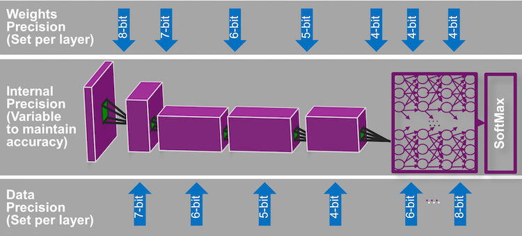 Note also that not all layers need the same bit width. You may start with wider widths of data, shrinking them as you move through the network layers, as illustrated below.