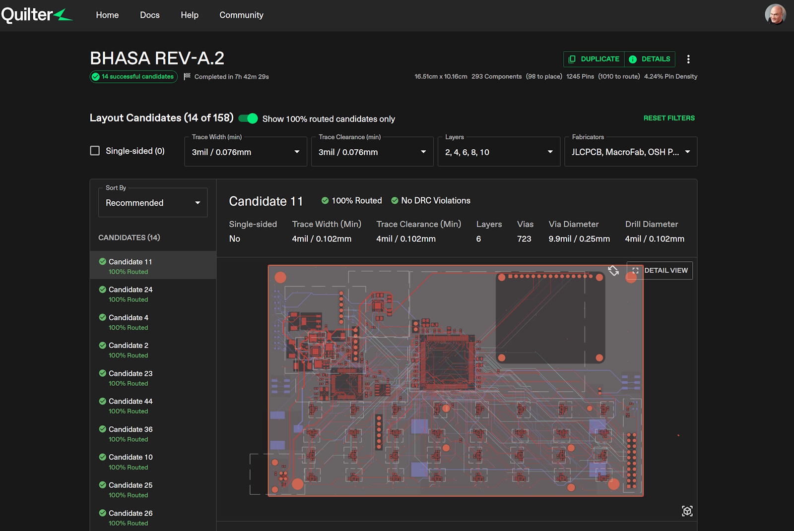 Ben says that once the schematic for this board had been captured, the placement and routing would have taken him between two and four days as an expert user. By comparison, he submitted the job to Quilter and began examining the finished candidates about two and a half hours later, ultimately choosing one that worked with his preferred manufacturer.