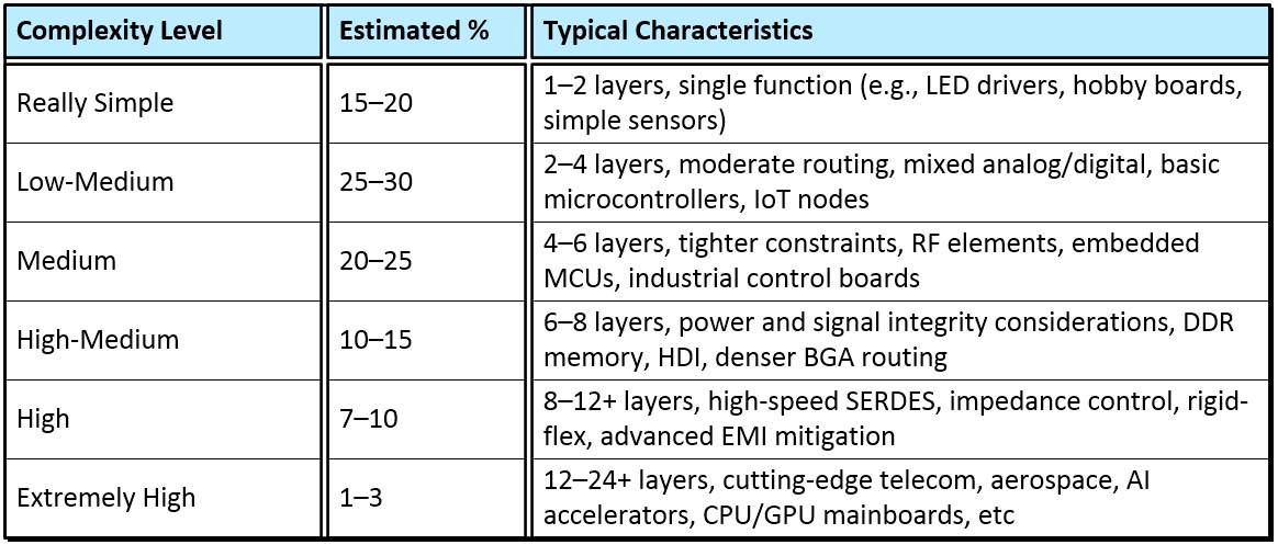 There’s no universal industry database that tracks all PCB designs in real time. However, we can build a reasonable estimate based on known trends from PCB manufacturers, industry surveys, and anecdotal experience across consumer, industrial, automotive, aerospace, and medical sectors. Based on this, can I offer the following rough estimate of the percentage distribution of PCBs being developed globally, categorized by complexity, for your perusal and consideration: