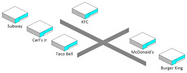 Wife and I were driving on I-15 southbound through Clearfield, Utah, and we took an exit there to get lunch. We found six fast food restaurants on the same corner of Main and M Street: