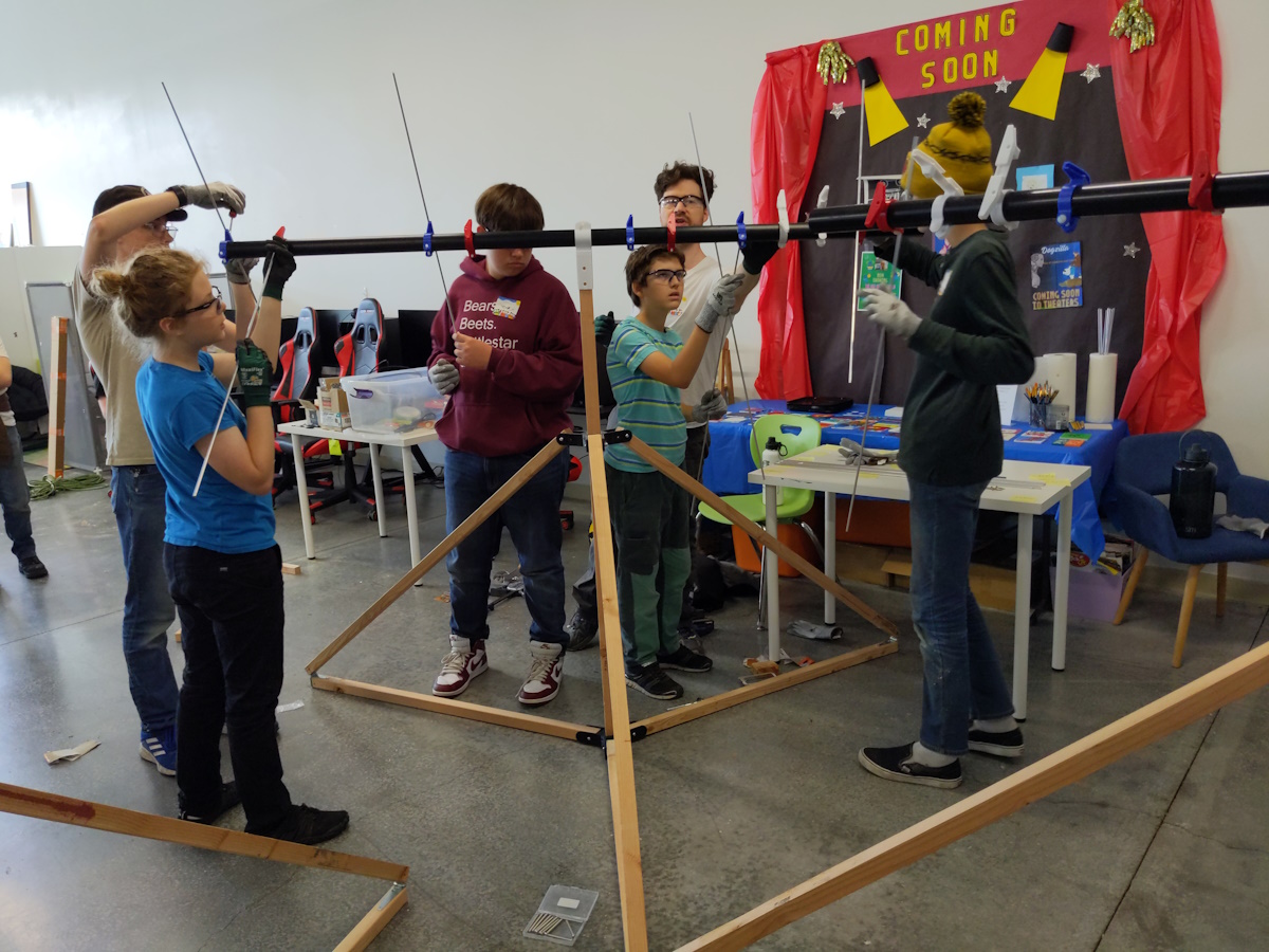 Zeke (near left) and fellow students constructing their new antenna (Source: KJ7NLL)
